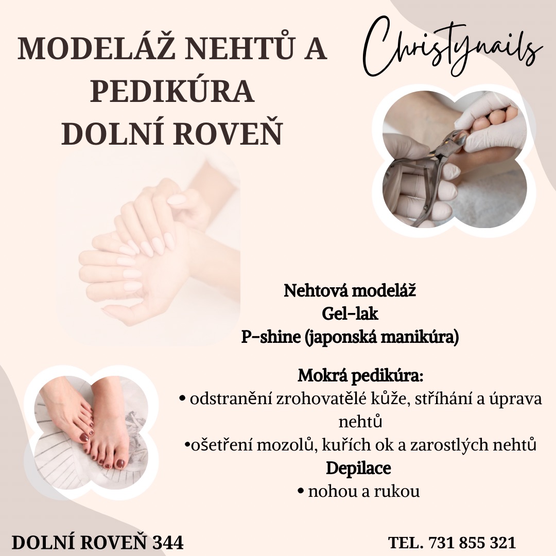 Od 1. dubna 2026 bude na adrese Dolní Roveň 344, v prostorách nehtového studia, nově otevřena pedikúra. Objednání a bližší informace získáte na telefonním čísle 731 855 321 .