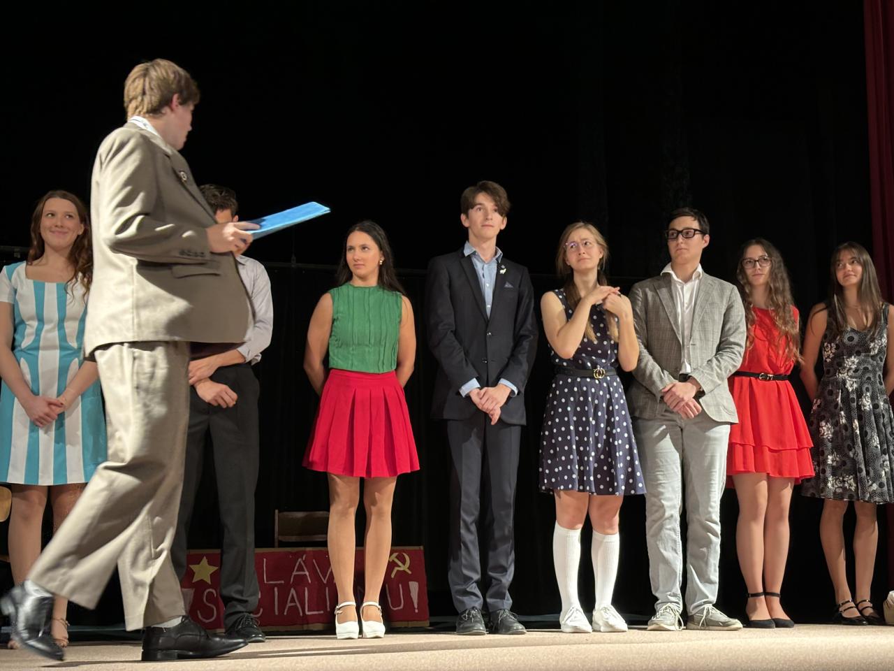 Divadelní představení hudební retro komedie Prima sezóna v podání Studia GyMo (ochotnický soubor gymnázia Mozartova Pardubice) v sále sokolovny v Dolní Rovni.